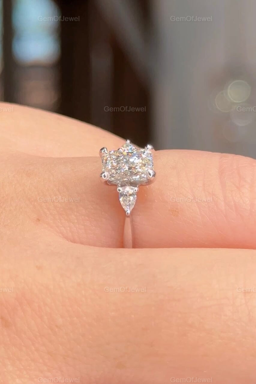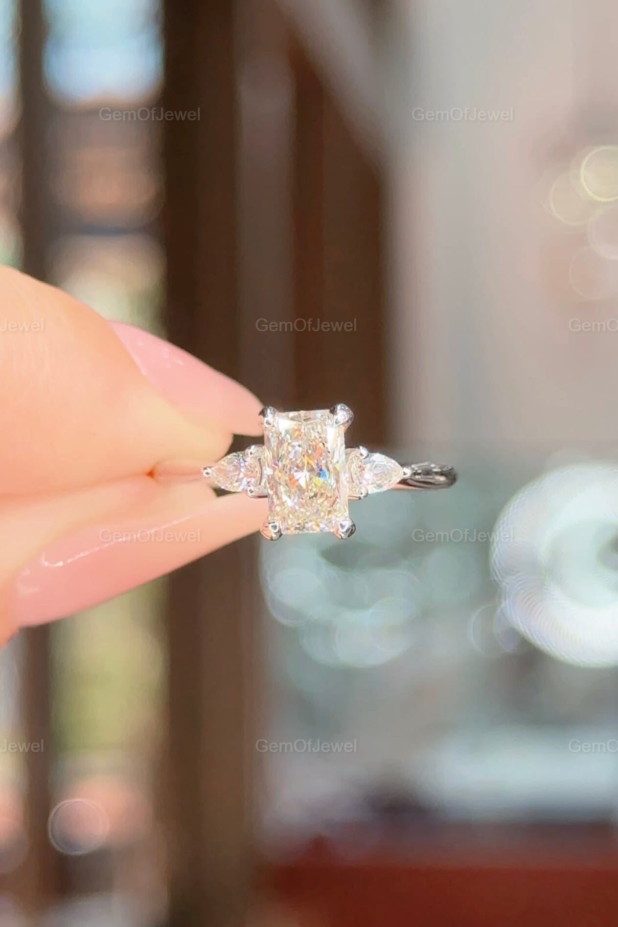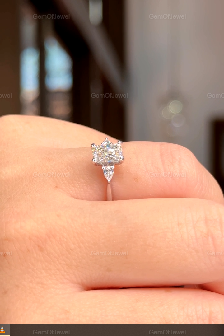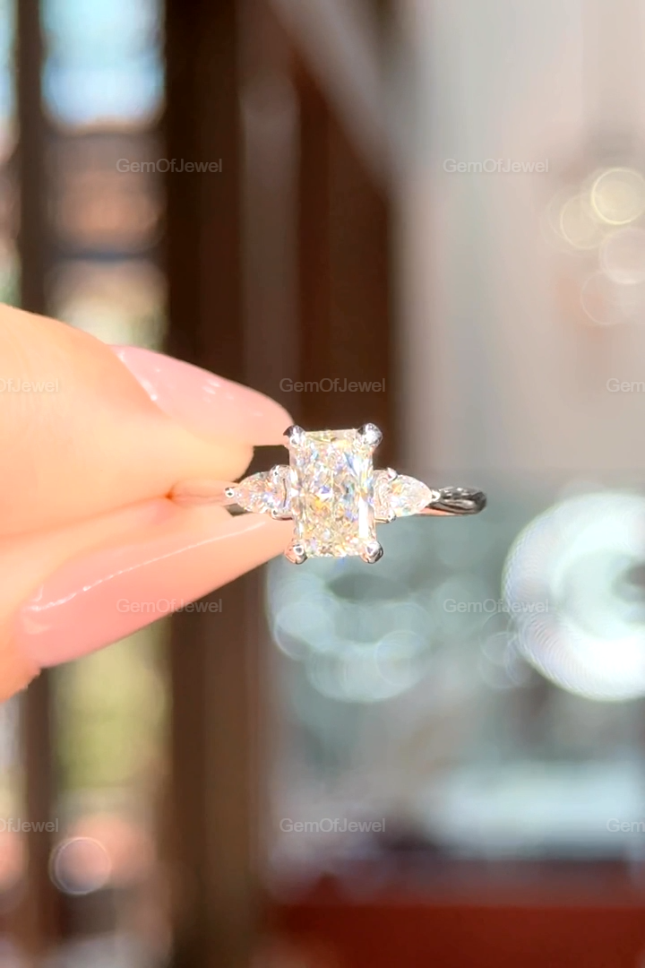 1CT Radiant Three Stone Diamond Wedding Ring, Radiant Moissanite Engagement Ring With Side Pear Diamond Ring, 1CT Radiant Moissanite Ring