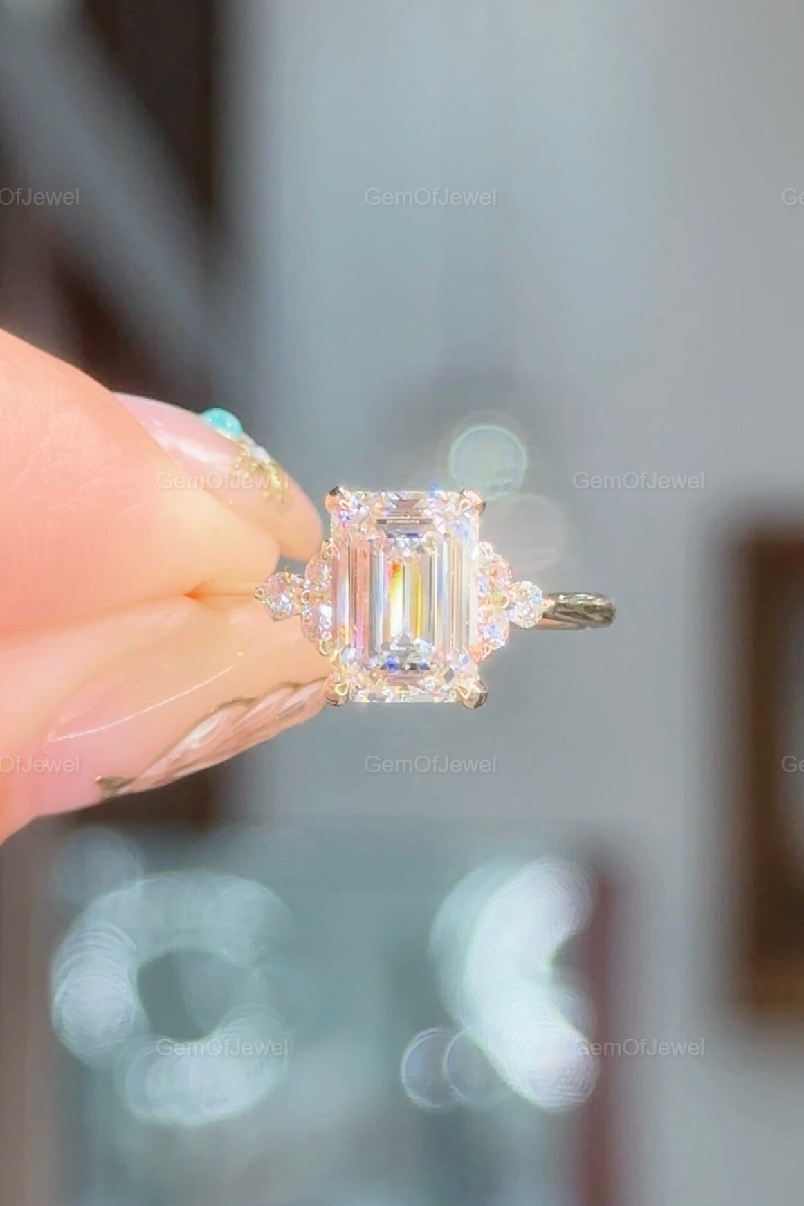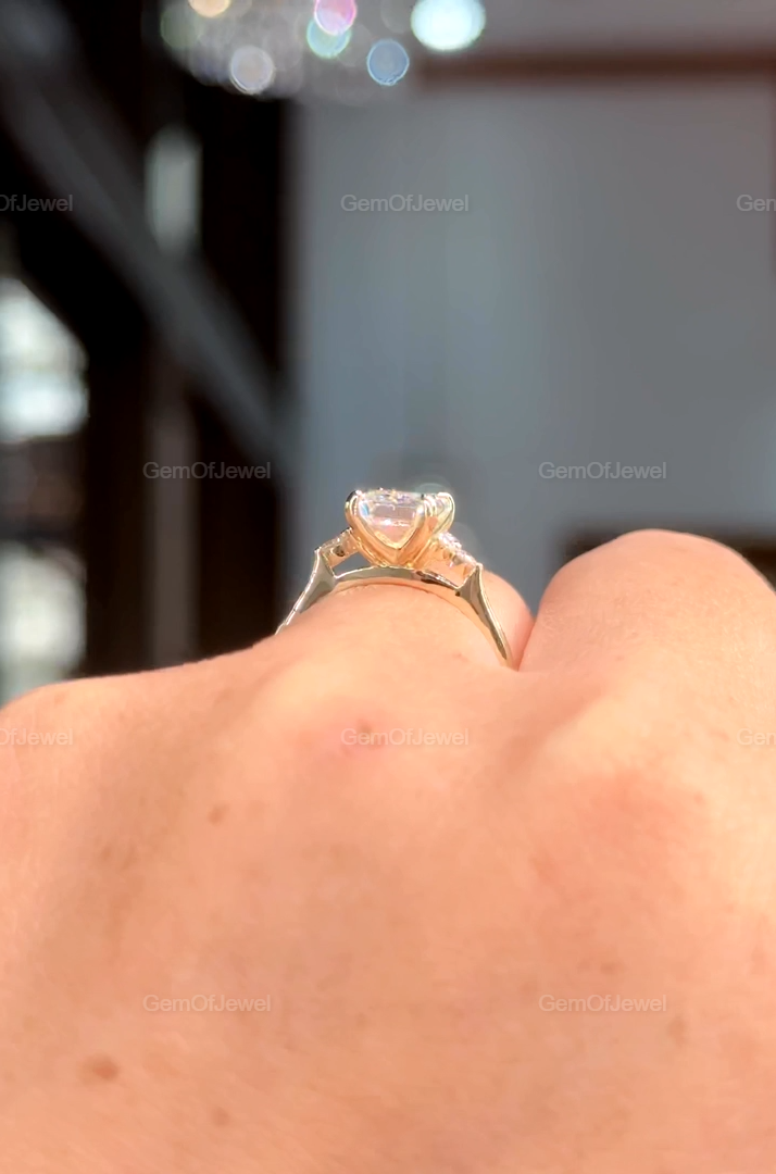 Emerald Moissanite Engagement Ring, Three Stone Wedding Ring With Side Round Diamond Ring, 2 CT Emerald Moissanite Diamond Solitaire Ring