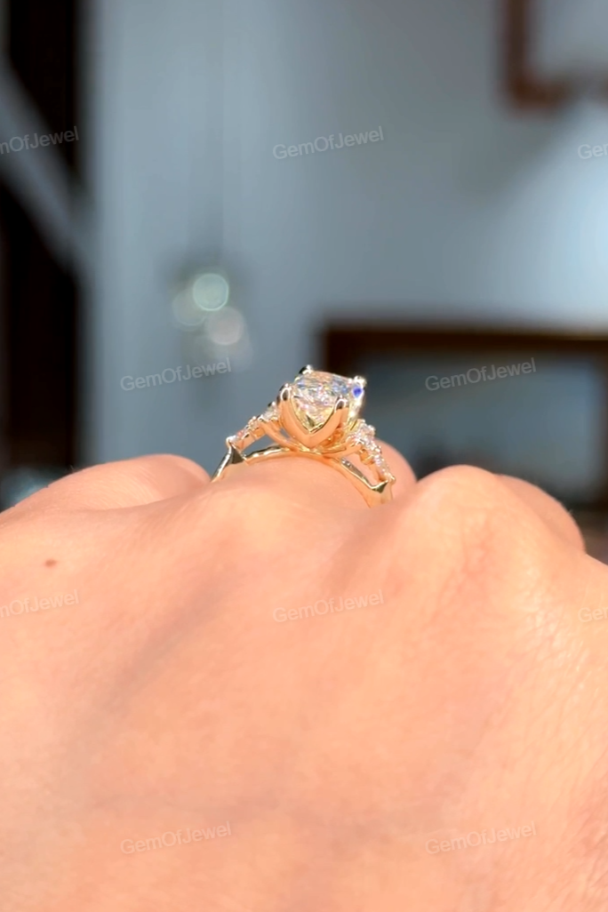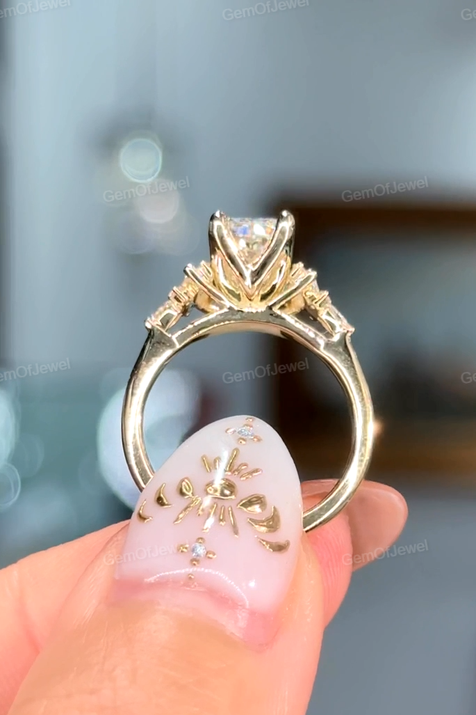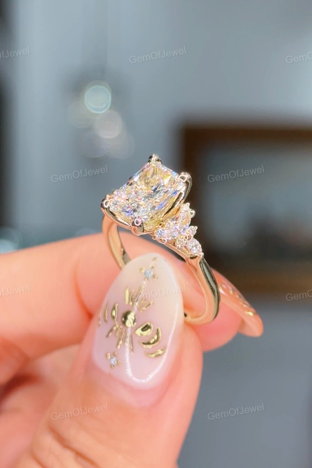 Radiant Cut Moissanite Diamond Ring With Side Marquise To Round Moissanite Diamond Ring, Flower Design Ring, Floral Moissanite Radiant Ring