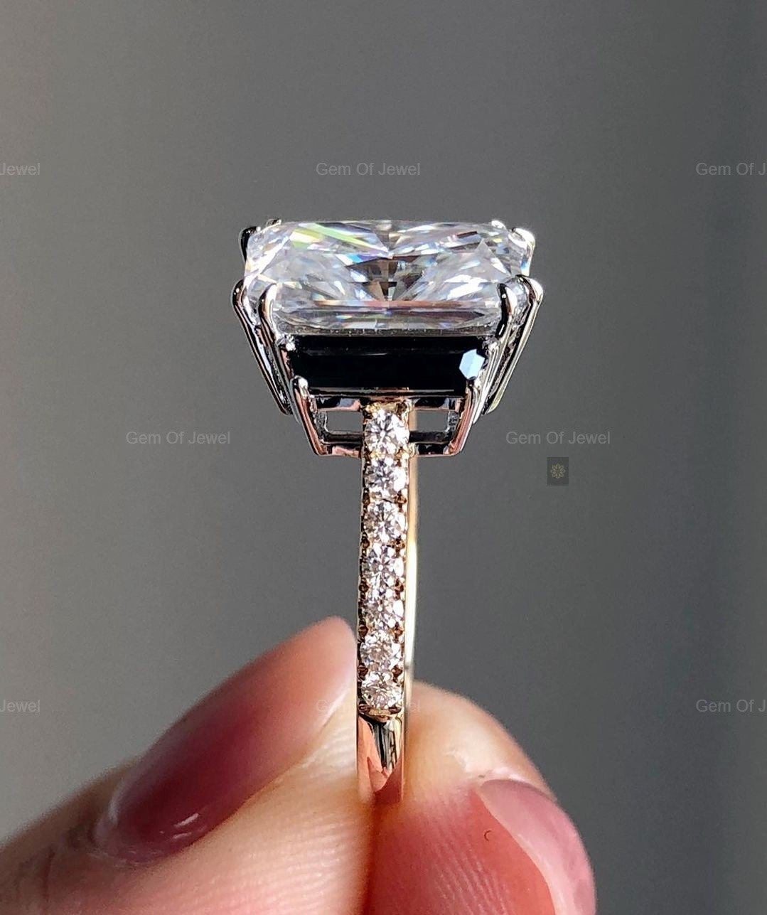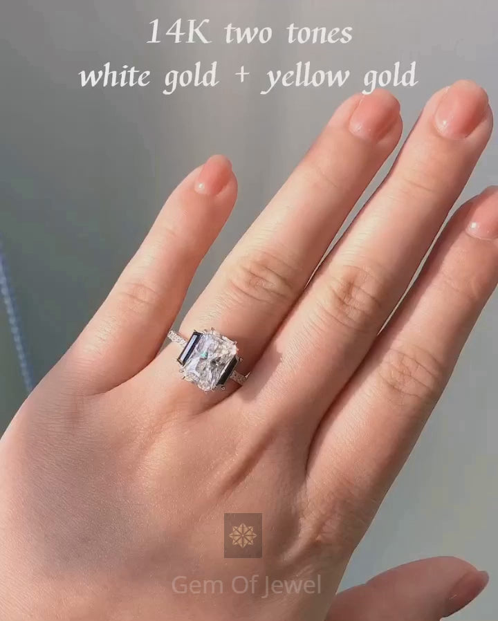Radiant Cut Diamond Ring With Side Black Tapered Baguette Moissanite Two Tone Gold Diamond Ring, Radiant Diamond Ring, Radiant Cut Ring