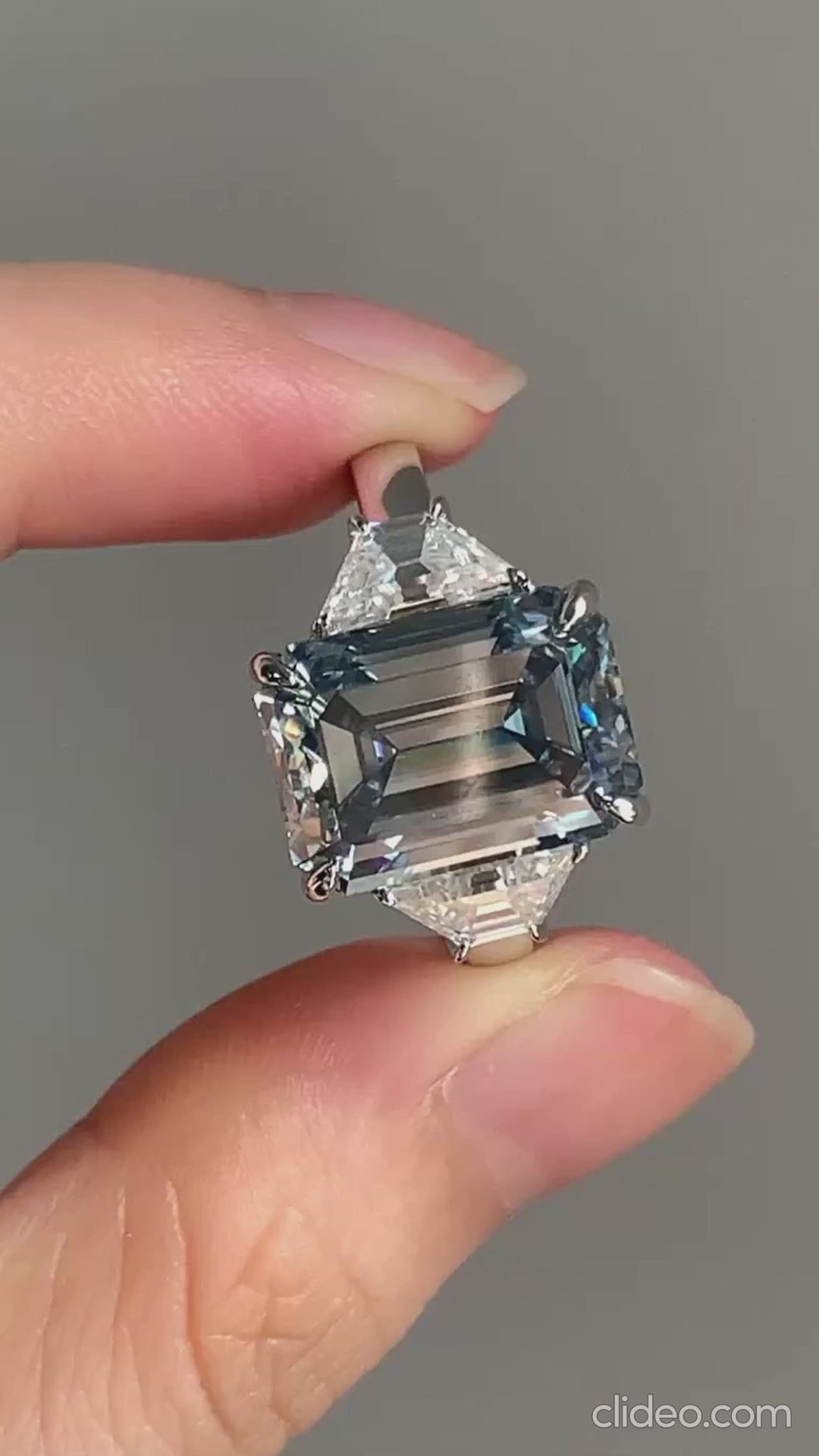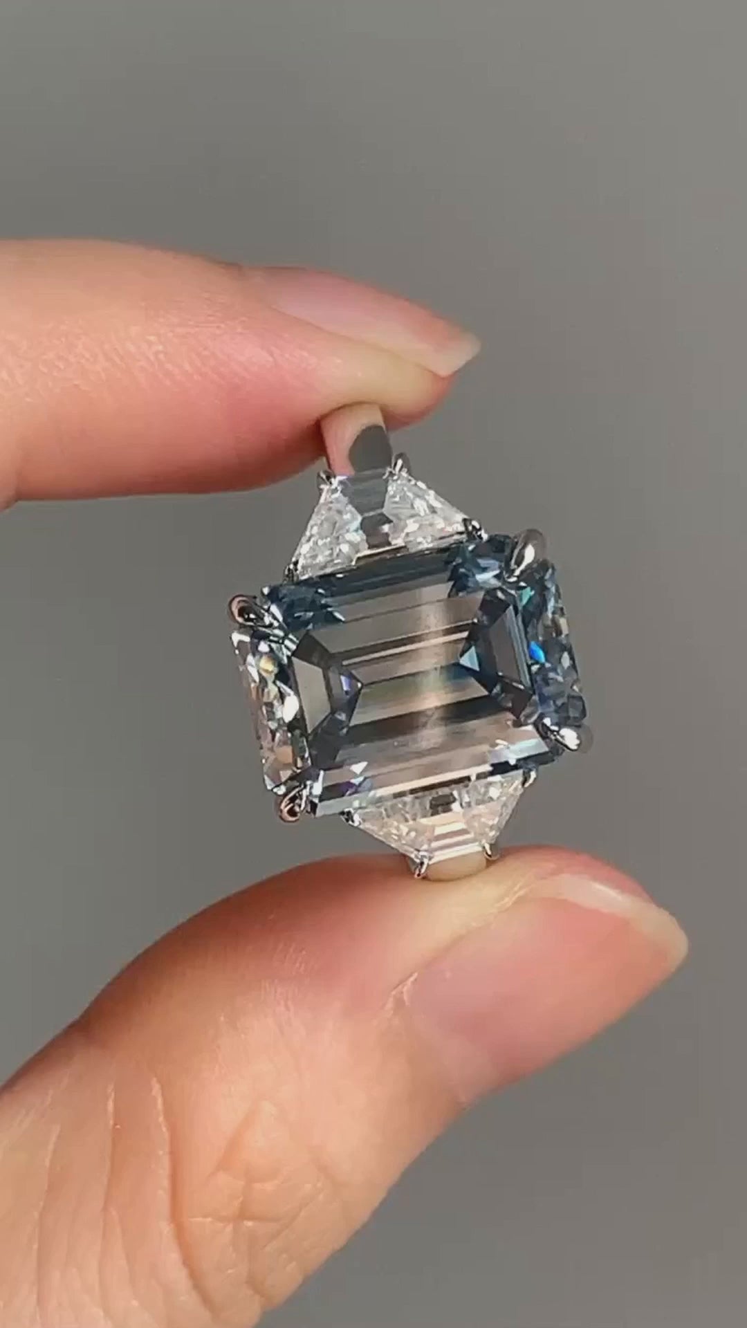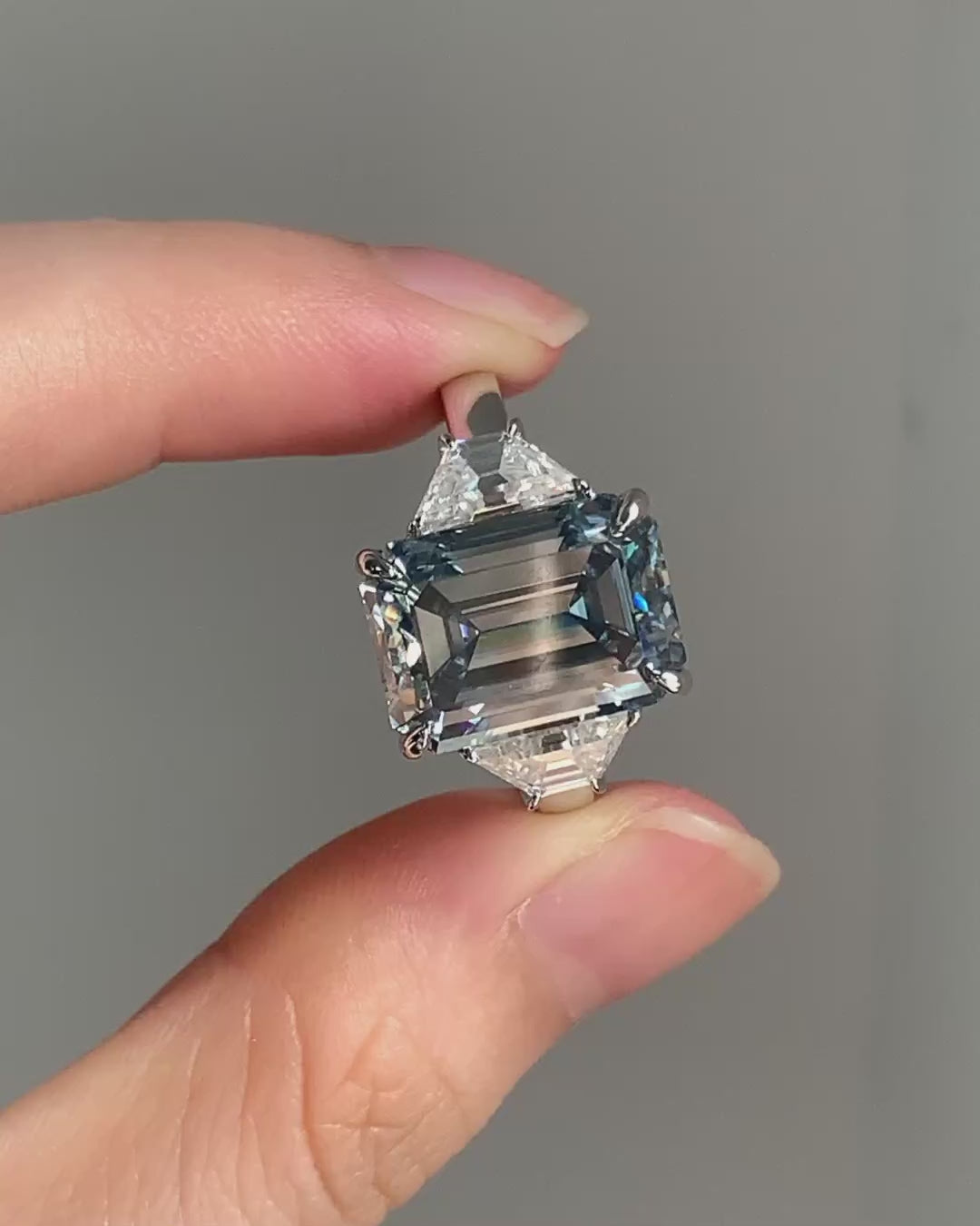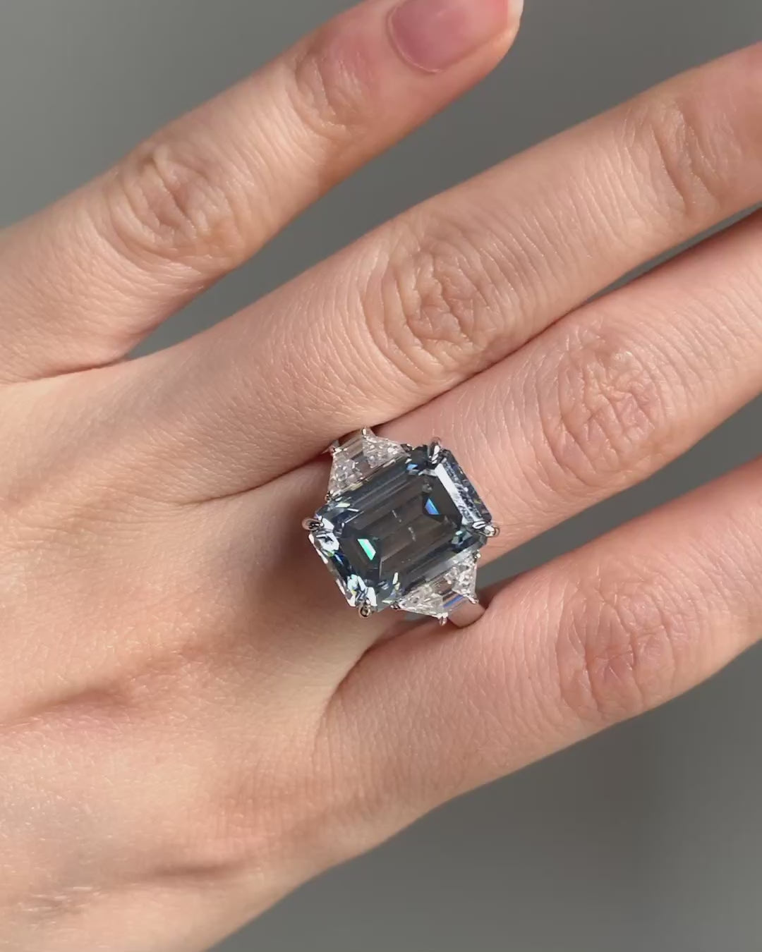 Grey Emerald Moissanite Diamond With Side Trapezoid Three Stone Moissanite Engagement Ring, Gray Moissanite Diamond Ring, Grey 3 Stone Ring