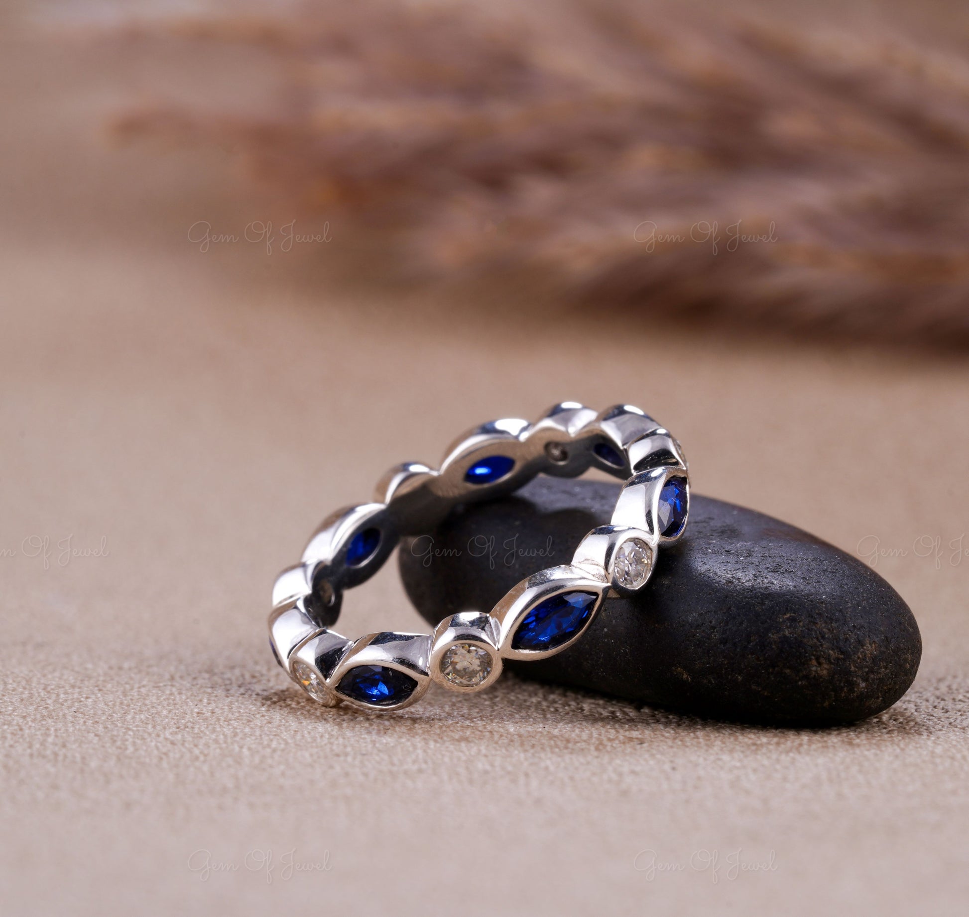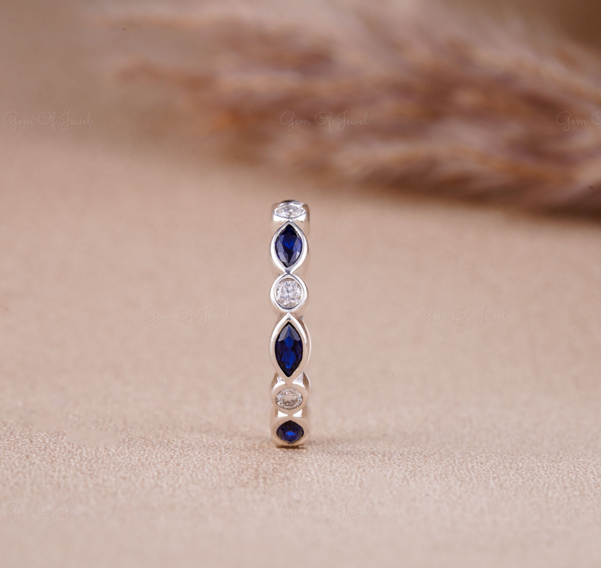 Round Diamond Full Eternity Bubble Band With Marquise Blue Sapphire Lab Diamond Wedding Matching Bezel Set Wedding Matching Band, Blue Sapphire Diamond Band For Her