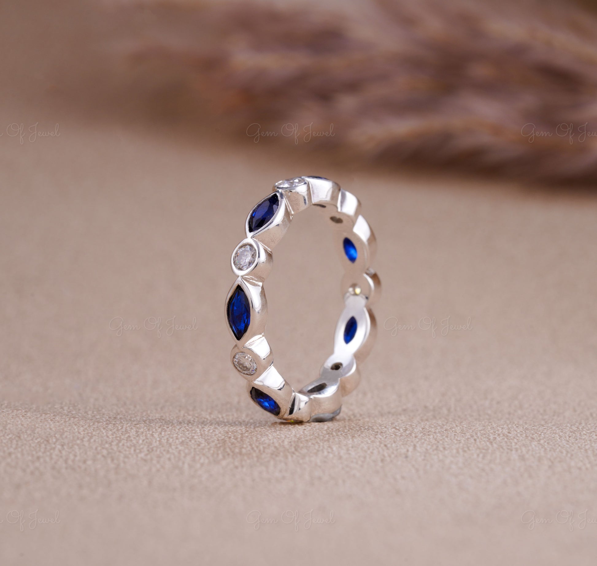 Round Moissanite Diamond Full Eternity Bubble Band With Marquise Blue Sapphire Lab Diamond Bezel Set Wedding Band, Blue Sapphire Band