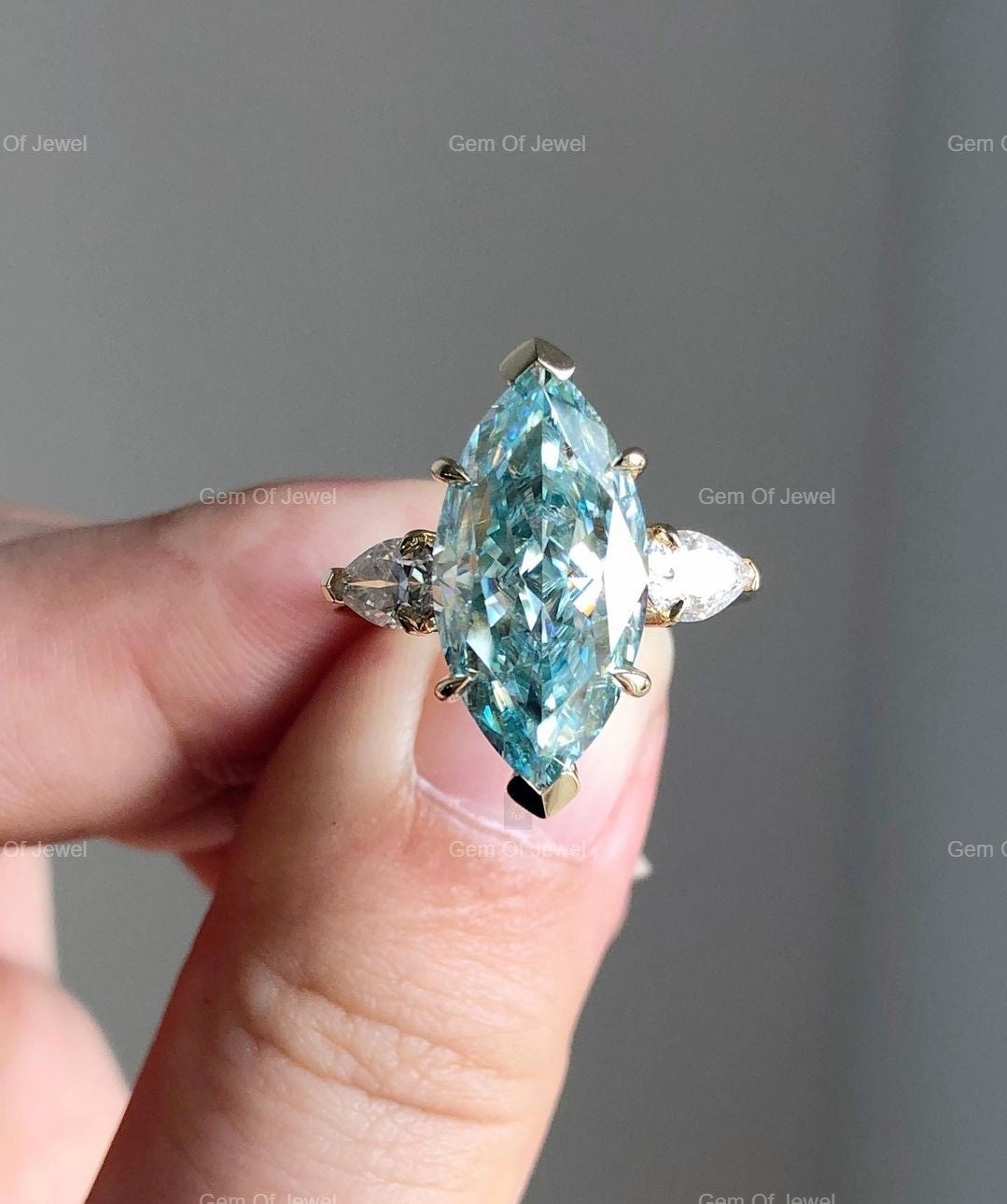 Marquise Green Moissanite Diamond Ring, Three Stone Marquise Moissanite Diamond Fancy Ring For Her, Green Moissanite Engagement Diamond Ring