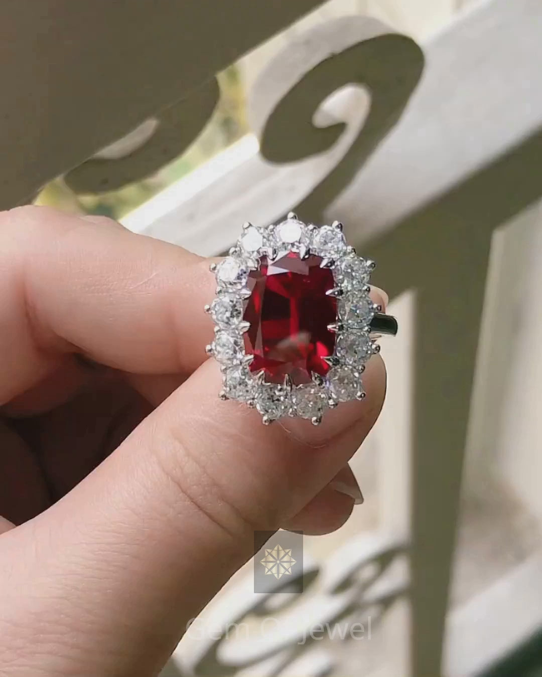 Ruby Stone Cushion Cut Ring, Ruby Stone Statement Ring For Her, Red Ruby Ring Cushion Diamond With Side Round Moissanite Diamond Ring