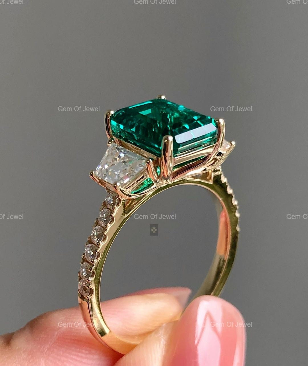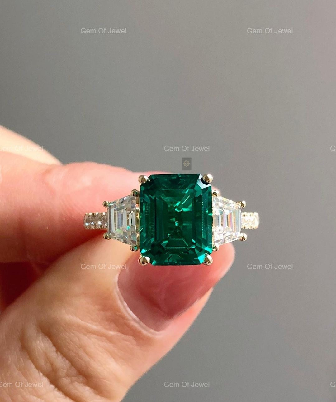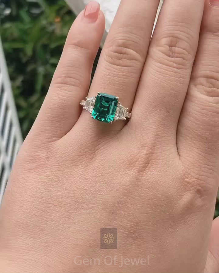 Green Emerald Diamond Three Stone Ring with Side Trapezoid Moissanite Diamond Ring, Green Lab Emerald Three Stone Diamond Ring Gift For Her