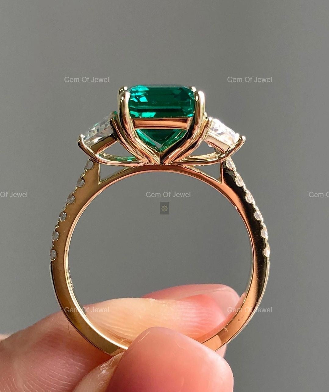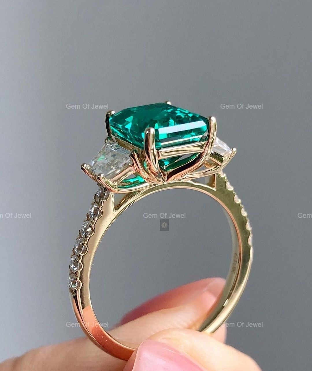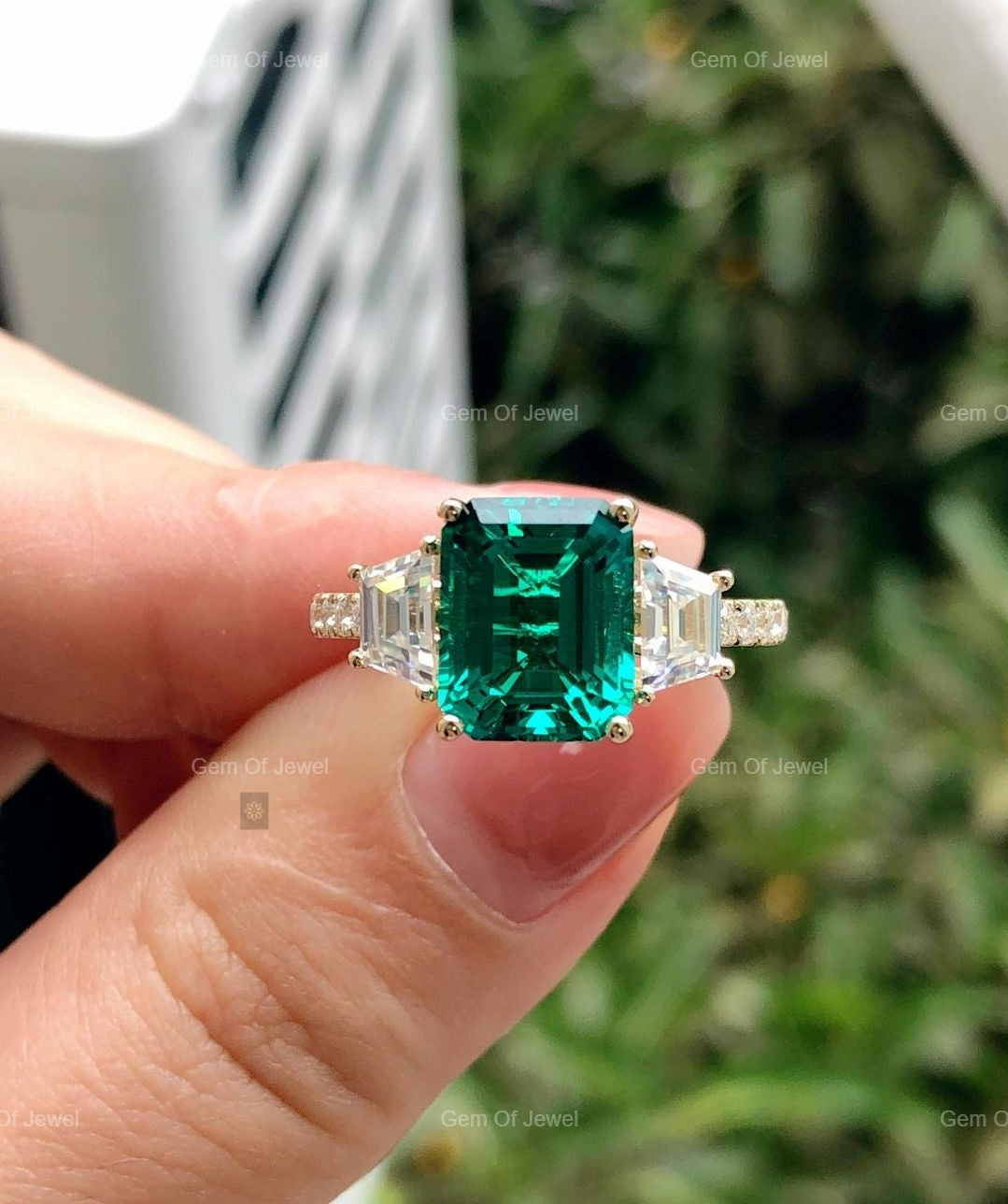 Green Emerald Diamond Three Stone Ring with Side Trapezoid Moissanite Diamond Ring, Green Lab Emerald Three Stone Diamond Ring Gift For Her
