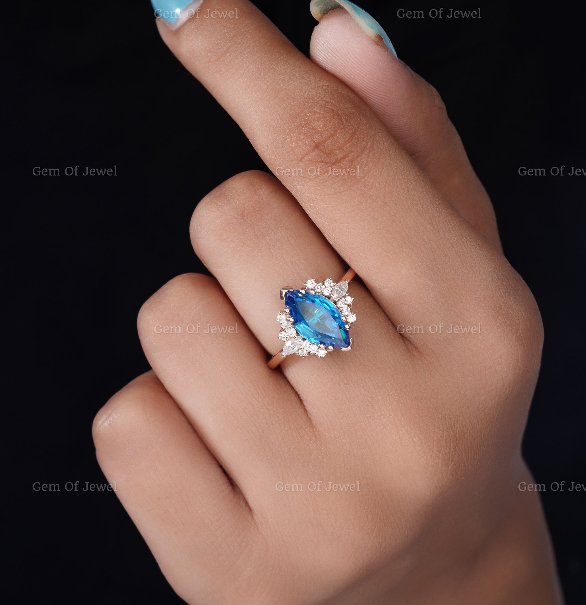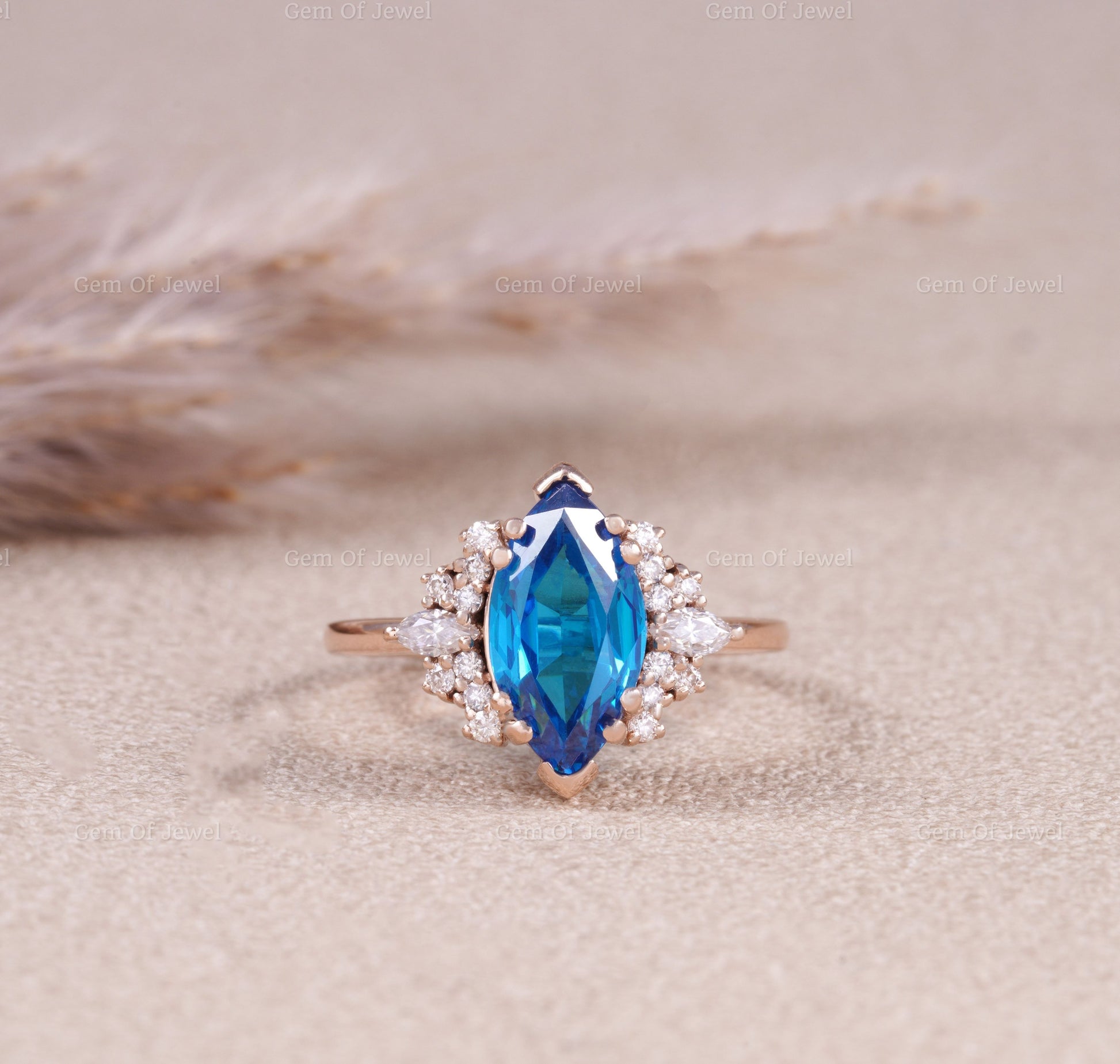 Blue Sapphire Marquise Lab Diamond Ring, Marquise Lab Diamond With Side Moissanite Diamond Ring, Blue Marquise Diamond Cluster Ring For Her