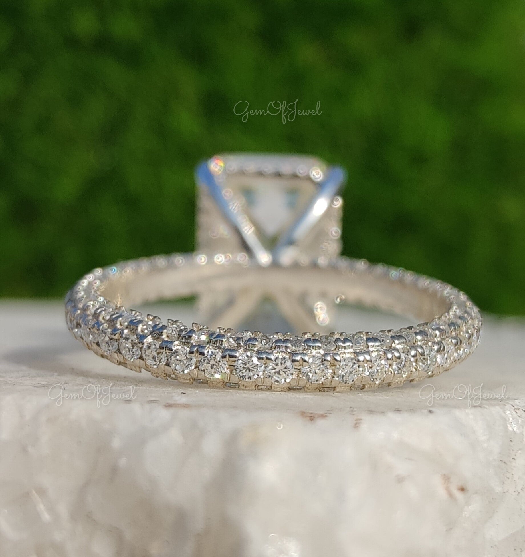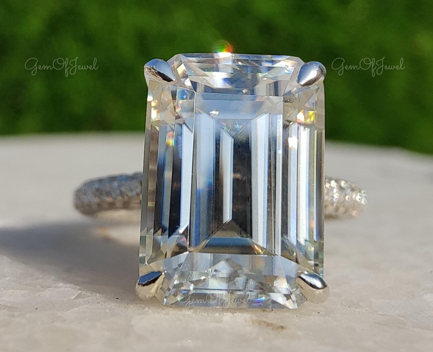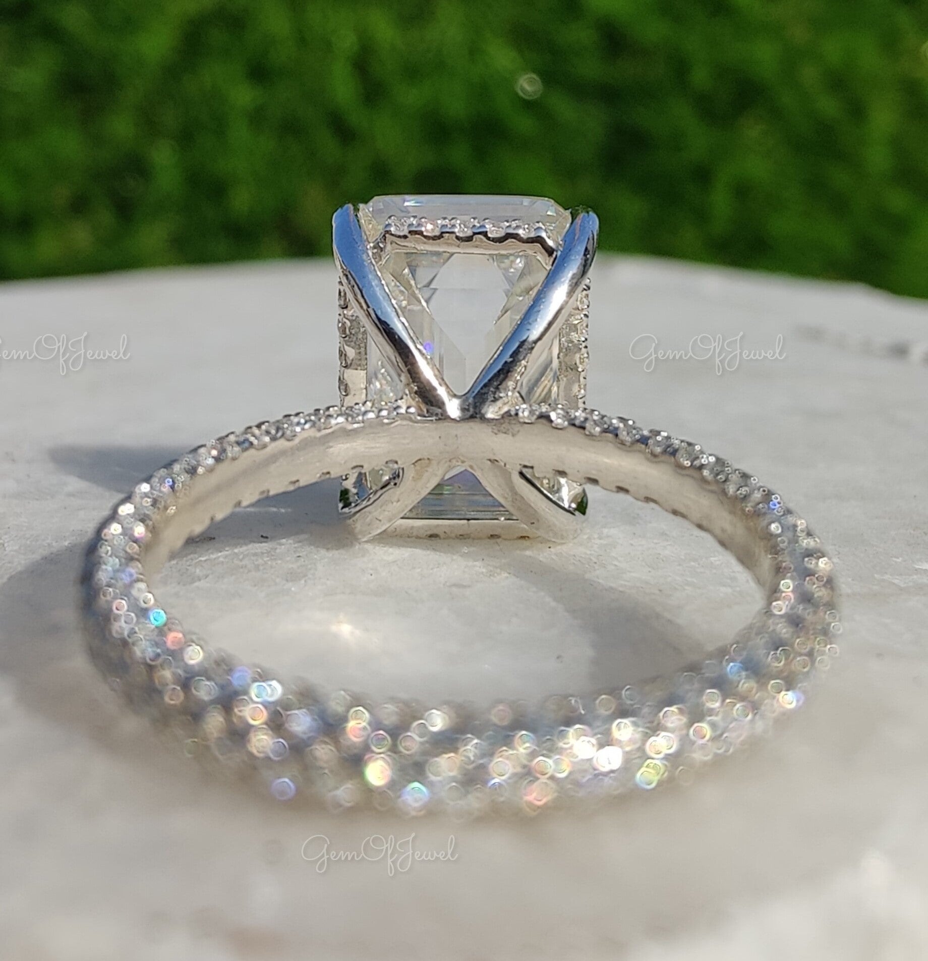 Emerald Moissanite Diamond Engagement Ring For Her With 3 Way Pave on Band With Halo, Emerald Diamond Moissanite Engagement Ring For Her