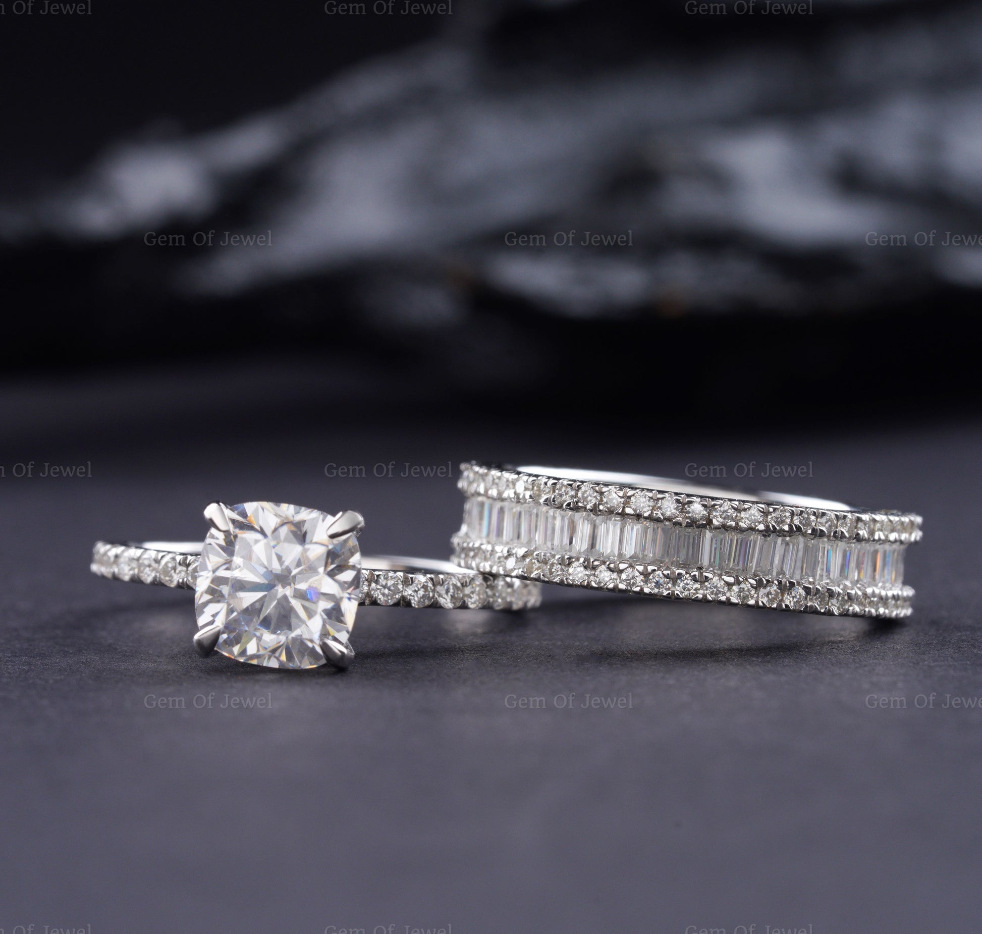 Cushion Cut Diamond Moissanite Gold Ring With Baguette Diamond Moissanite Band Bridal Set, Wedding Ring, Cushion Moissanite Bridal Ring Set