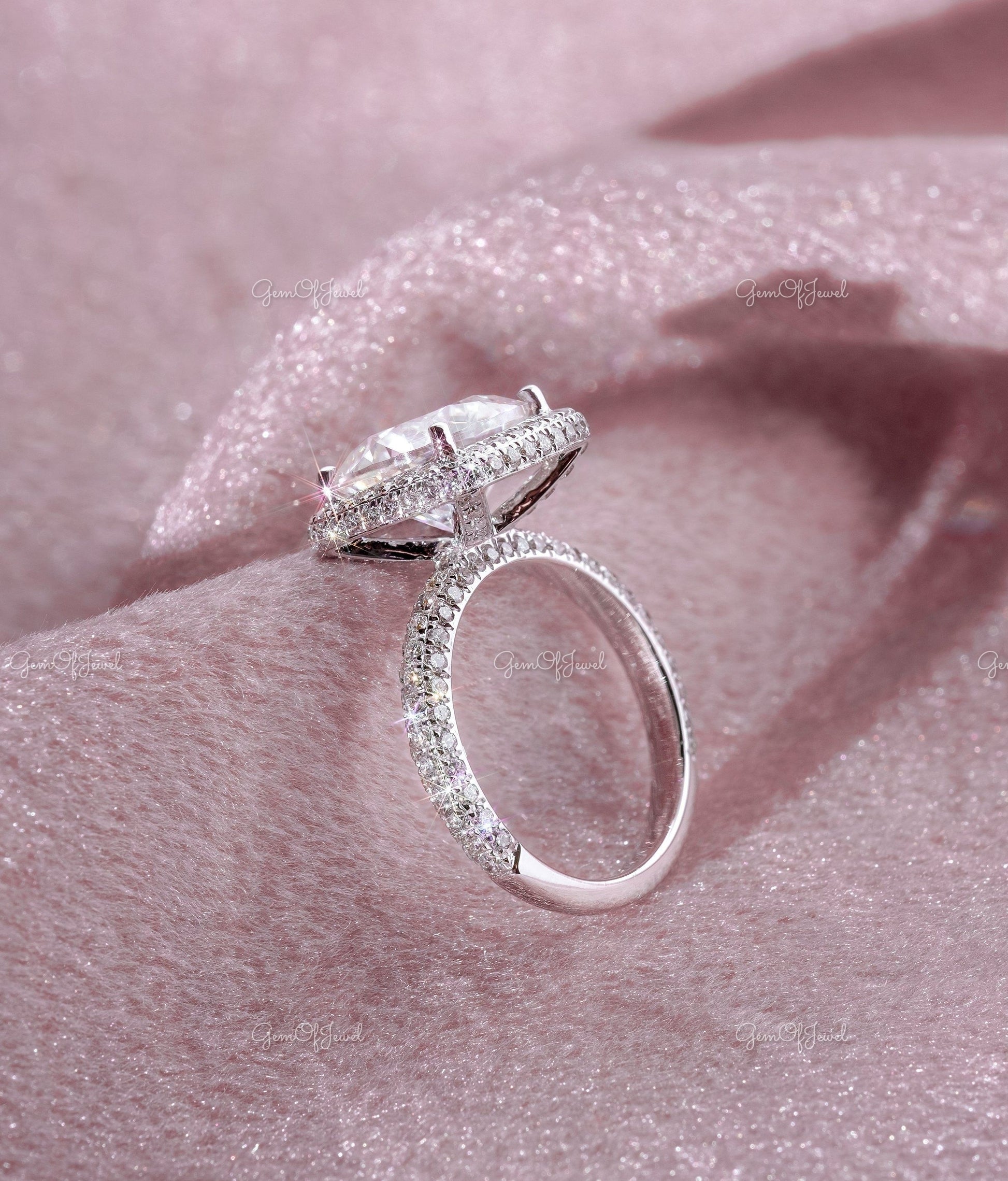 Cushion Moissanite Diamond Ring With Halo Of Round Diamond, 2 Way Halo And 3 Way Eternity Diamond Band Engagement Ring For Her, Cushion Ring