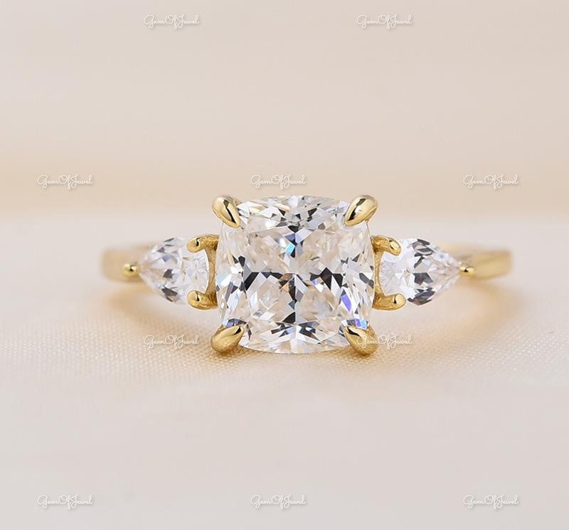 Cushion Moissanite Diamond Three Stone Ring With Side Pear Moissanite Diamond Ring