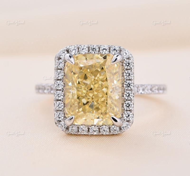 Yellow Sapphire Radiant Cut Sapphire Simulated Stone With Halo Of Moissanite Diamond And 3/4 Moissanite Eternity Band, Gold Ring For Her