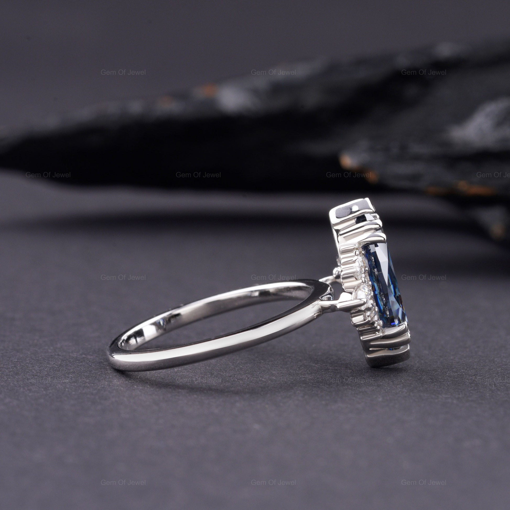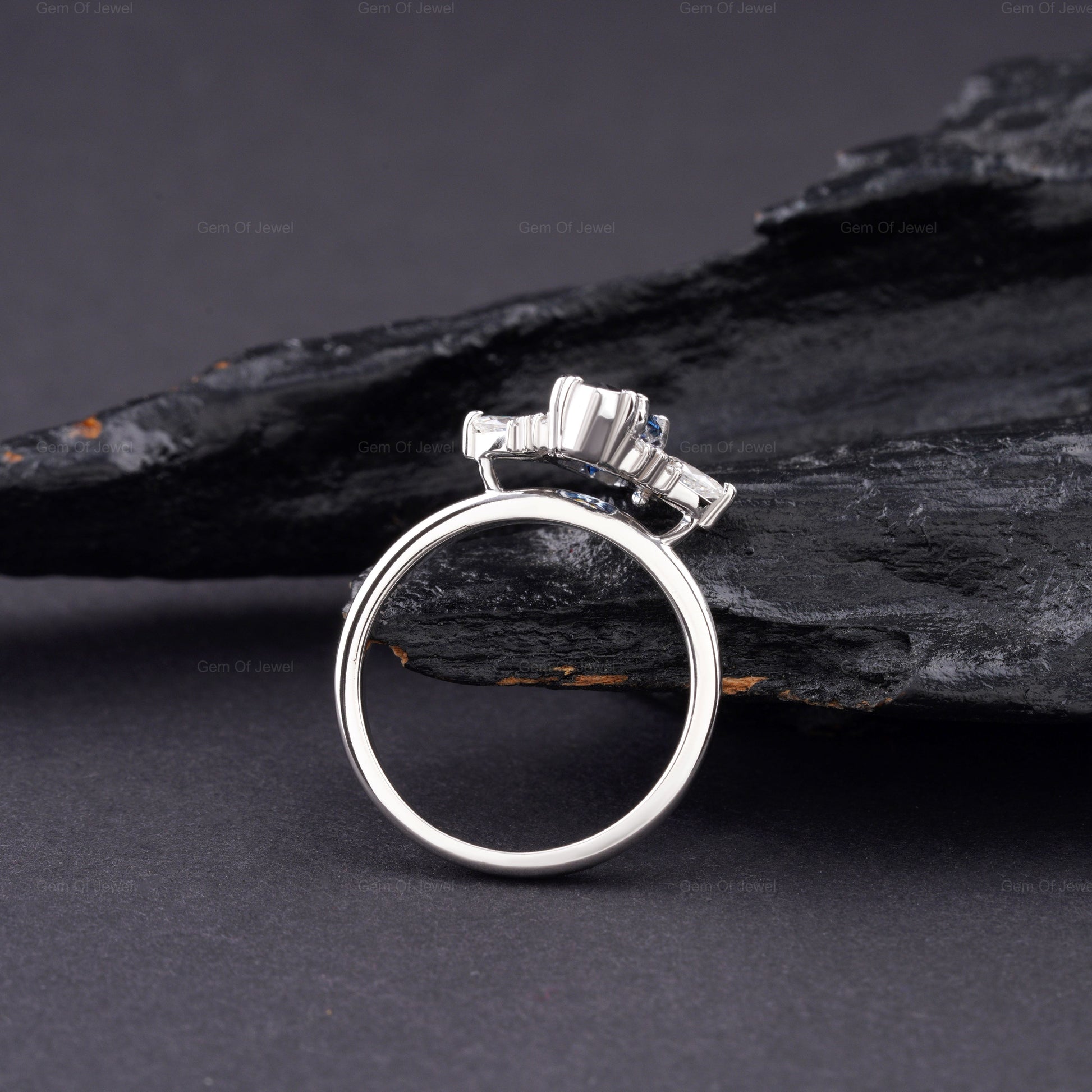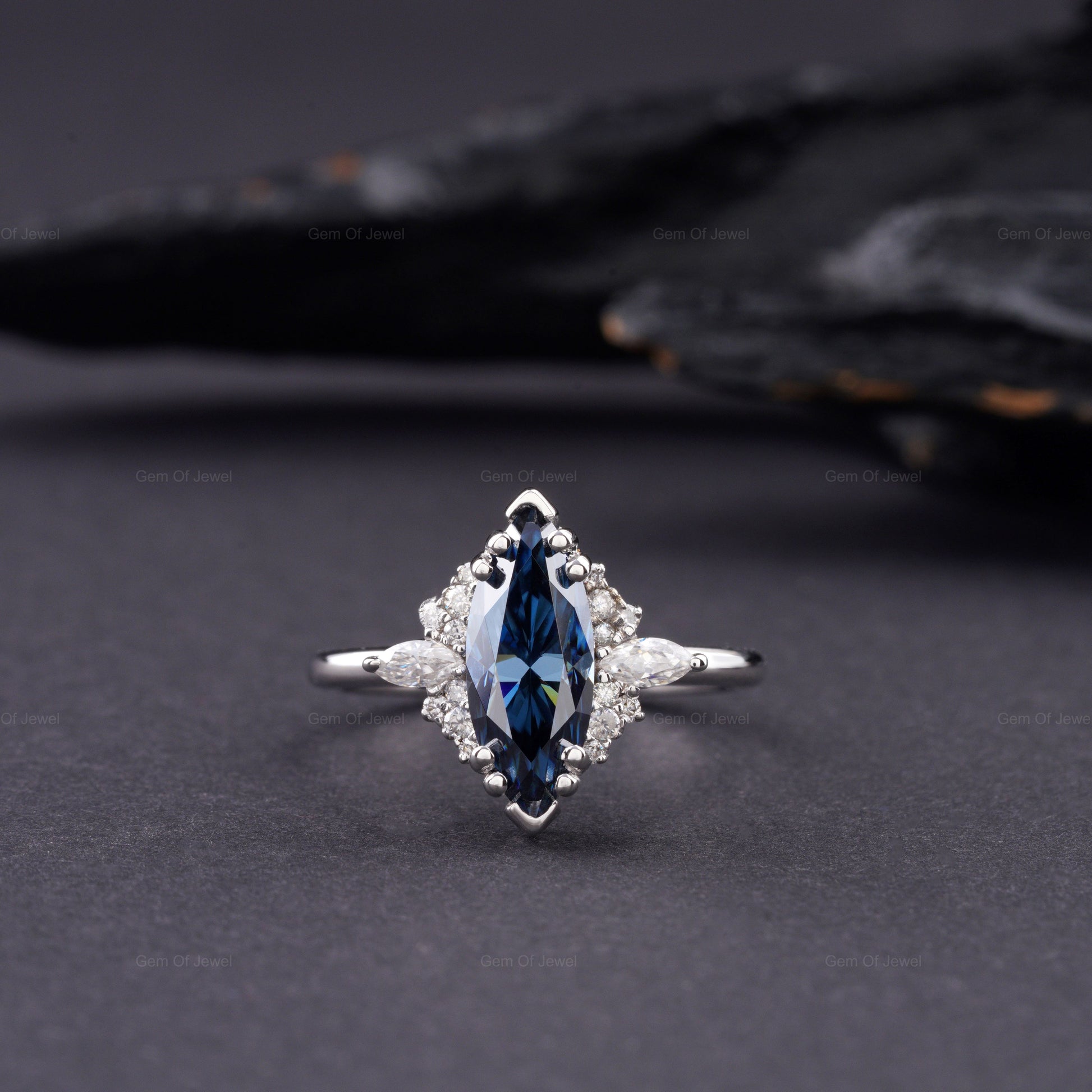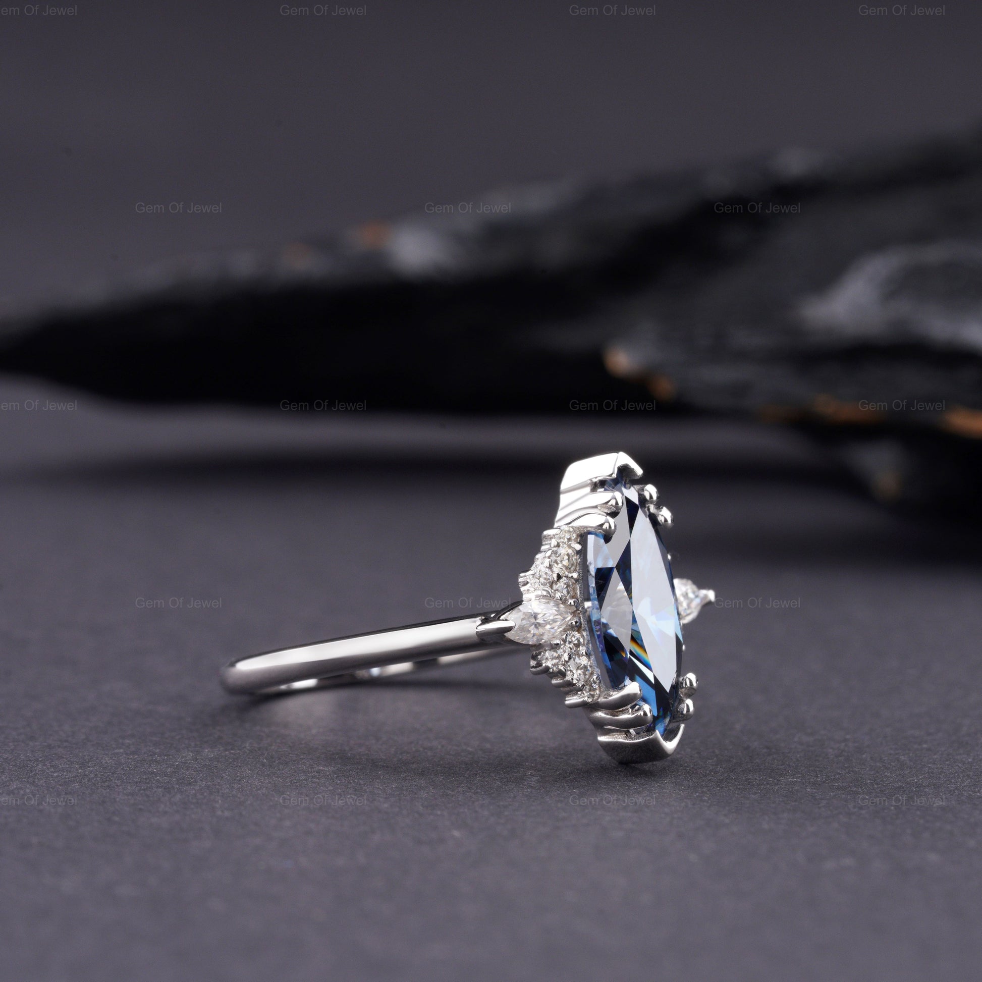 Blue Moissanite Marquise Diamond Ring, Marquise Moissanite Diamond With Side Moissanite Diamond Ring, Blue Marquise Diamond Cluster Ring