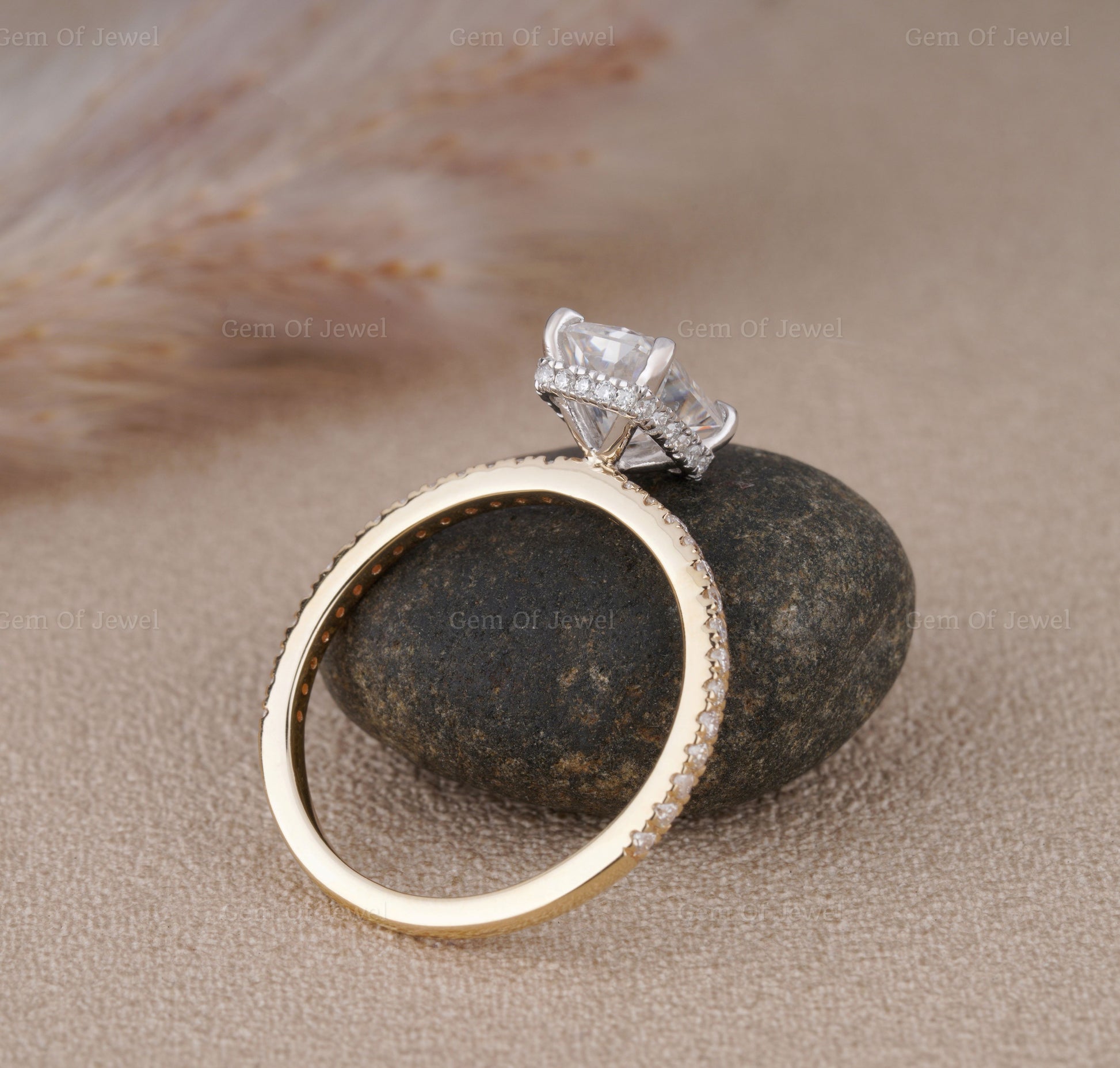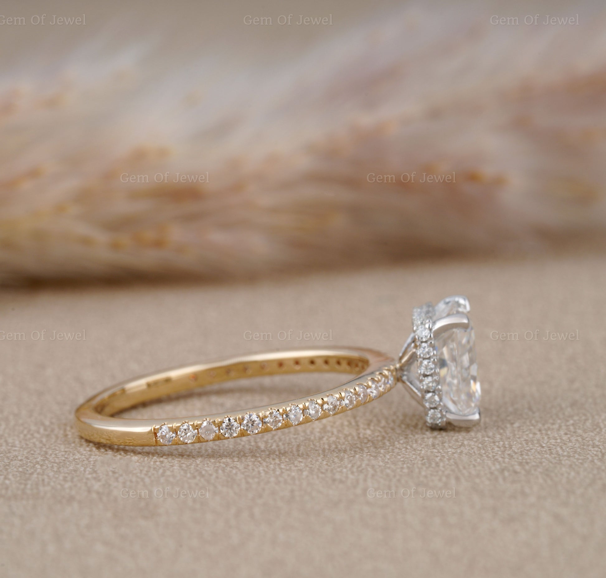 Two Tone Gold Radiant Moissanite Diamond Ring With Halo Of Round Moissanite Diamond And Pave Half Eternity Diamonds, Radiant Diamond Ring