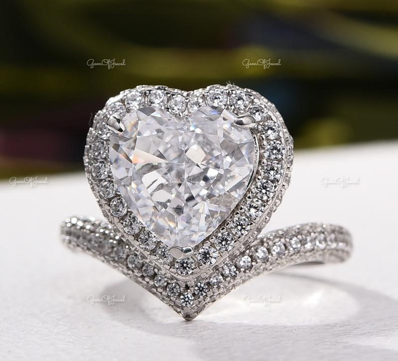 Heart Shape Moissanite Diamond With Halo And 3/4th Eternity Band Engagement Ring for her, gift for her, heart shape diamond ring