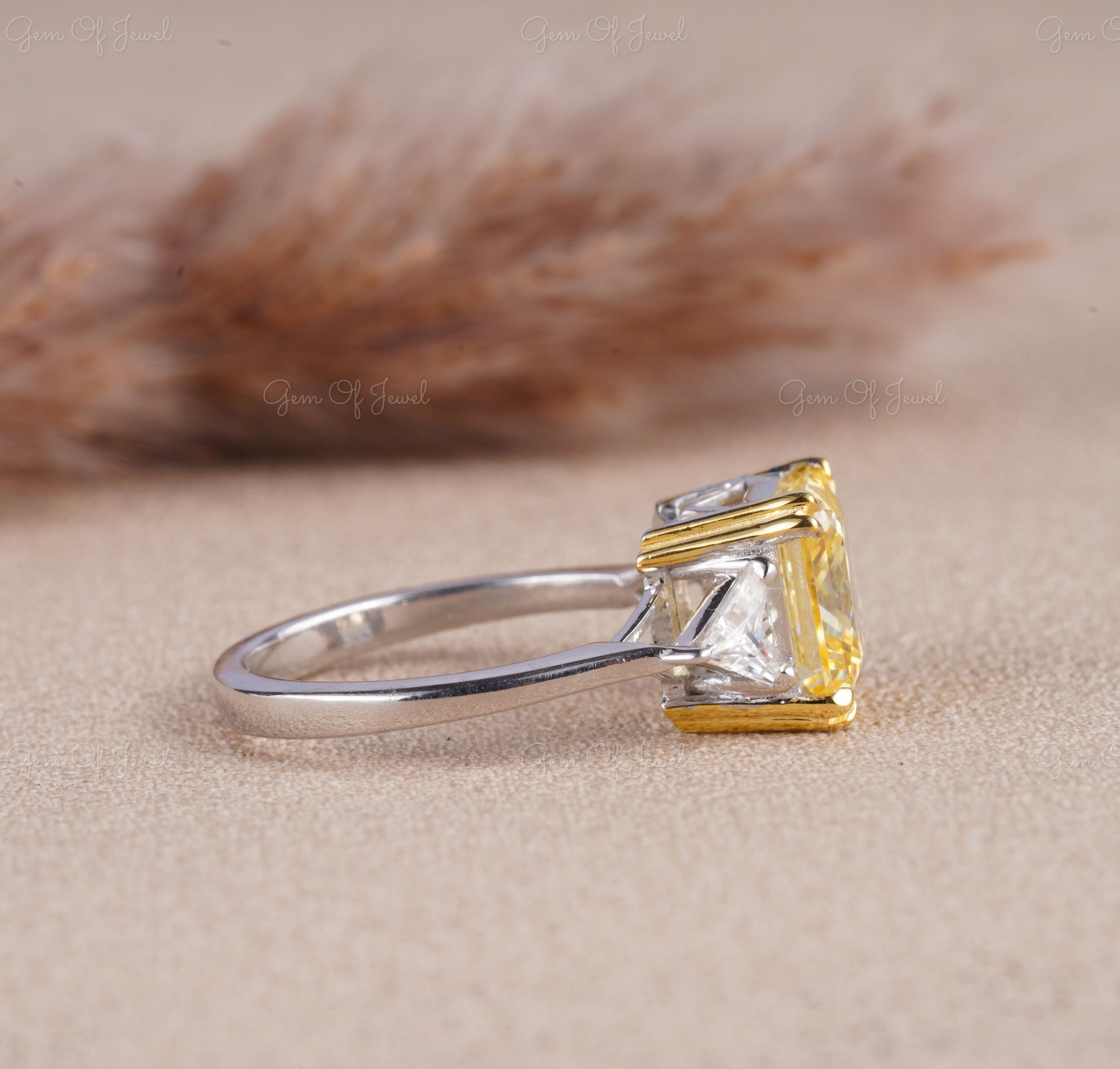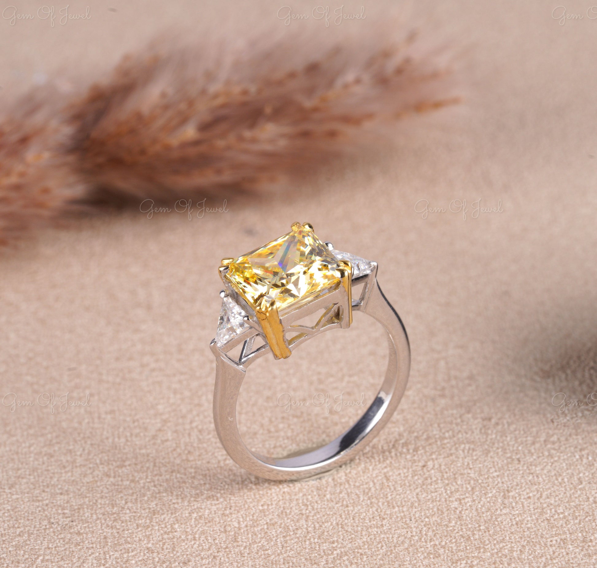 Square Radiant Cut Yellow Sapphire Diamond With Side Triangle Moissanite Diamond Three Stone Ring, Yellow Square Radiant 3 Stone Ring