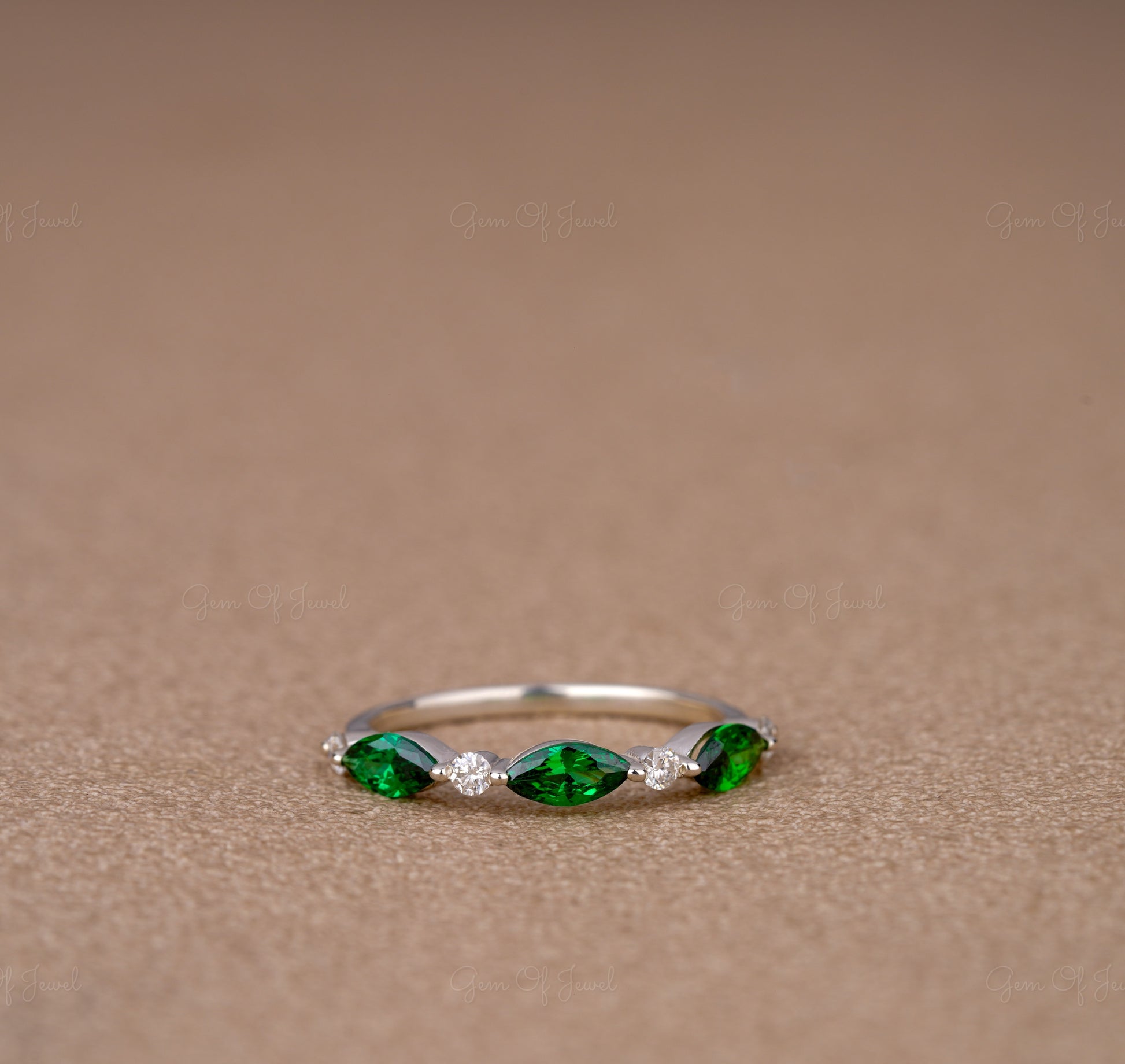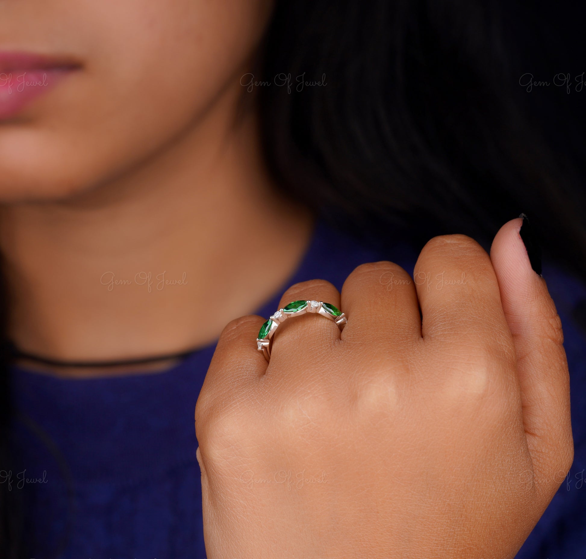 Green Marquise Diamond Wedding Band, Marquise Green Sapphire And Round Moissanite Diamond Matching Band For Her, Matching Wedding Band Gift